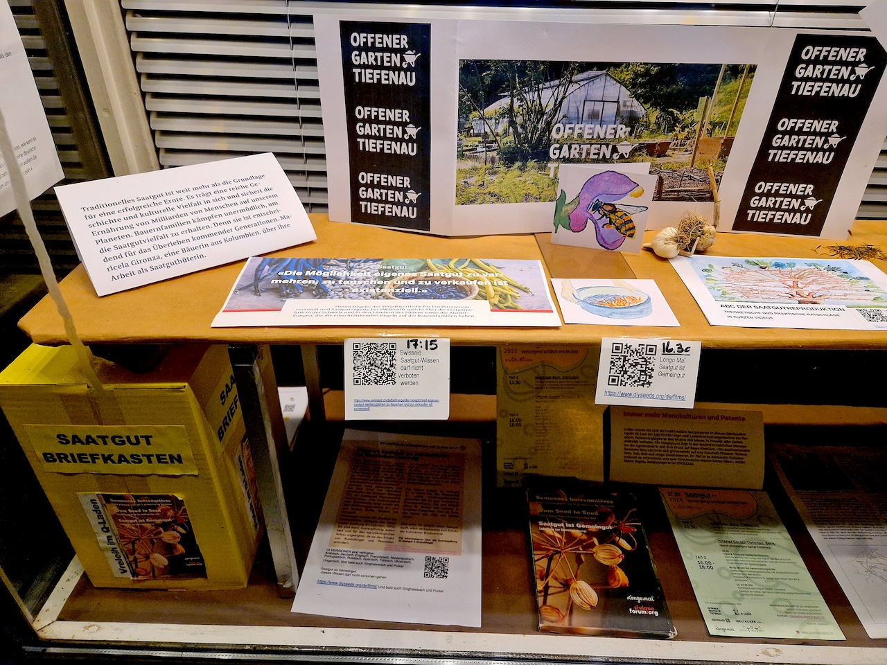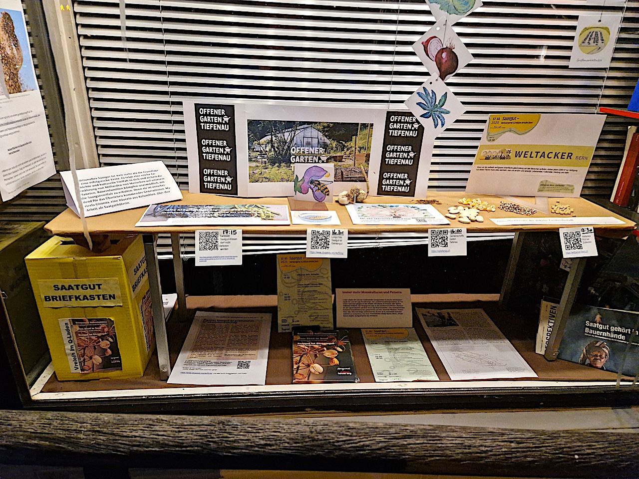 Ab Februar steht unsere Saatguttauschbörae im Q-Laden-Schaufenster, bei schönem Wetter im Gärtli bereit.